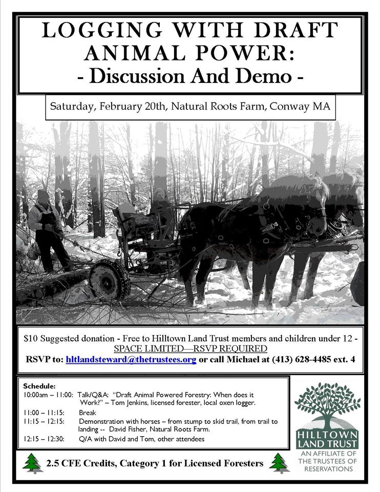 Experience draft animal powered forestry with Hilltown Land Trust on February 20th! Learn about draft animal power from a local licensed forester and then watch a horse-logging demonstration by David Fisher and his horses of Natural Roots Farm! $10 suggested donation and FREE to Hilltown Land Trust members. All are welcome! Be sure to RSVP as space is limited. Send questions and registration to hltlandsteward@thetrustees.org or call (413) 628-4485 ext. 4